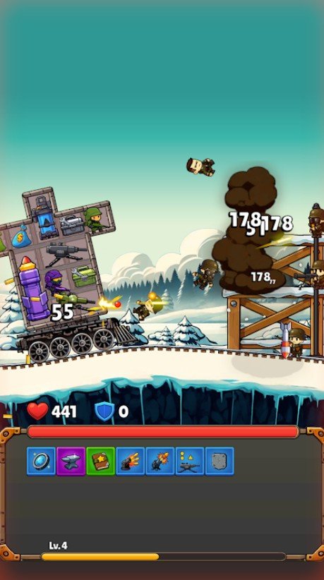 В самом начале пути ваш поезд будет совсем небольшим и довольно слабым, благо, что и противник не будет отличаться мощью. Уничтожая врагов, вы будете получать ресурсы, на которые можно провести улучшения техники.