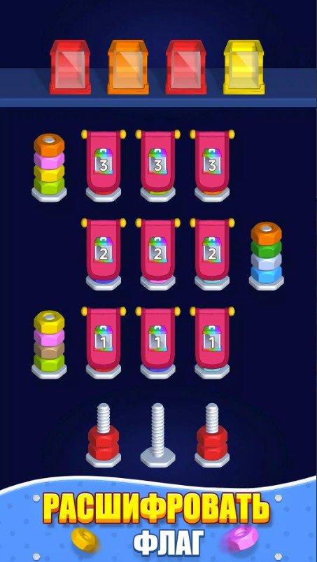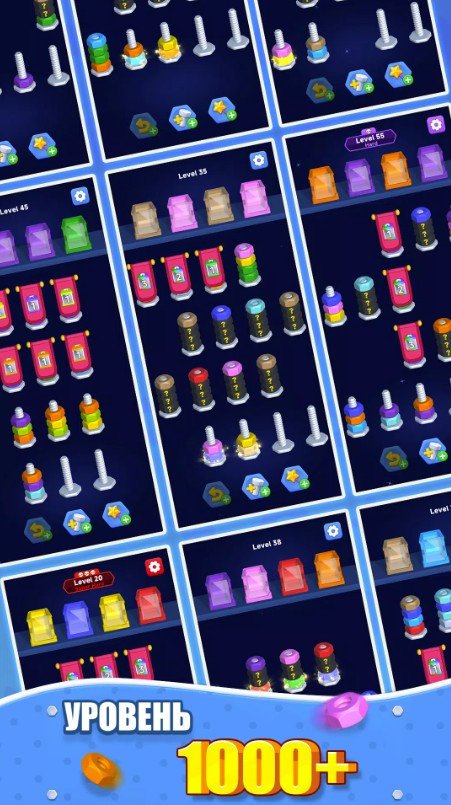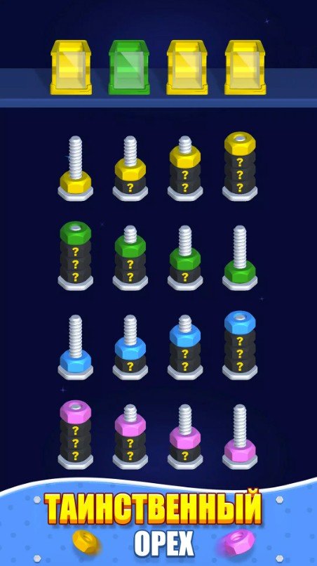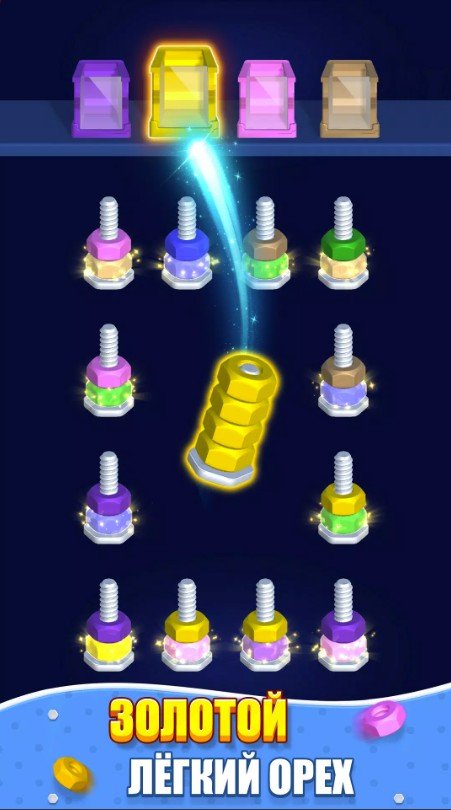 Сам геймплей прост в своем в освоении. Вам нужно просто менять местами гайки на шурупах, чтобы собрать нужные комбинации по цвету. Также будут открывать подсказки, бустеры и усиления, которые помогут в прохождении. Однако их количество строго ограниченно, поэтому надо будет помощь использовать с умом в нужных ситуациях. В игре красочная графика и плавная анимация, а также сочные цветовые решения.