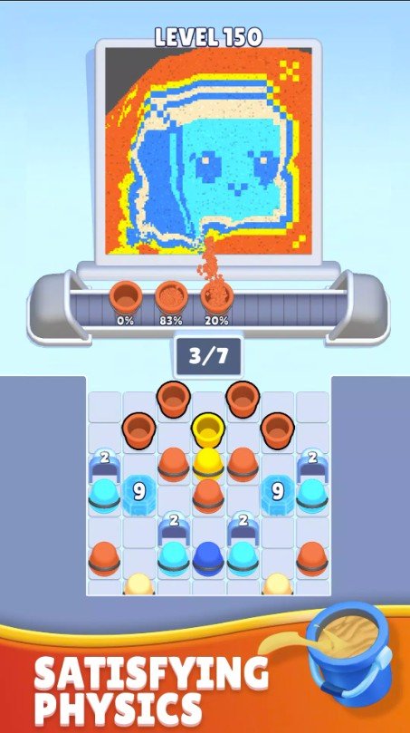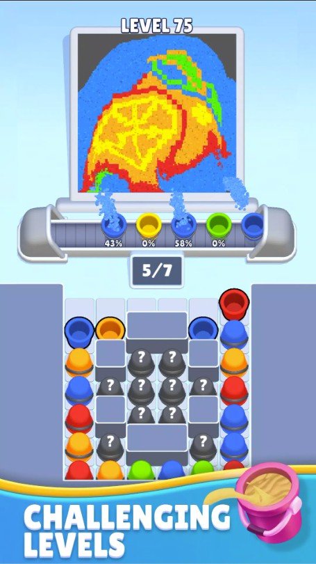 Постепенно цветов станет больше, сложность картин выше, а ведра будут двигаться быстрее. Вам нужно будет продумывать свои действия, умело реагировать и решать разные задачи наперед. В игре красочная двухмерная графика с сочными цветами, а также достоверная физика сыпучести песка и плавная анимация. Управление точное и интуитивное, которое легко можно освоить и сразу погрузиться в прохождение сложных уровней.