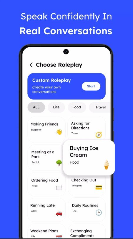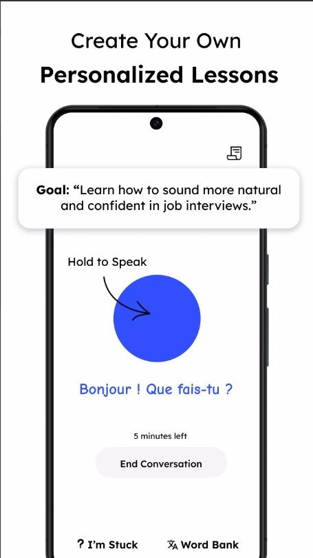 В приложении есть более 200 готовых сценариев, например, путешествия, работа, повседневные диалоги, походы в магазин или кафе. Можно создать свой сценарий, если нужна практика конкретной темы. Ваш виртуальный собеседник ведет беседу голосом. Он подстраивается под ваш уровень владения языком и темп речи. Можно практиковать как короткие диалоги, так и длинные, сложные беседы.