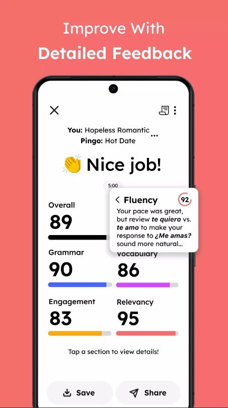 После разговора приложение показывает ошибки в грамматике, проблемы с произношением, насколько речь была беглой, какие слова использовались и что можно улучшить. Это помогает осознанно исправлять ошибки и совершенствовать речь.