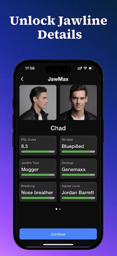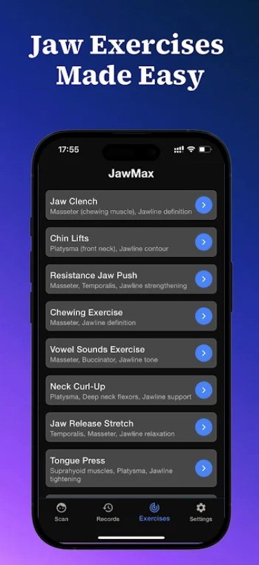 JawMax ― приложение с курсами тренировок и подсказок, для того, чтобы улучшить линию челюсти, укрепить мышцы лица и обновить осанку. Причем программа создает индивидуальнее упражнения и советы исключительно под вас, используя камеру и алгоритмы искусственного интеллекта. Благодаря чему получиться получить точные курсы, которые помогут и подойдут только вашей форме лица и челюстных мышц. После обработки снимков, станут доступны комплексы тренировок, разделенные на категории, это и более простые, так и сложные упражнения, движения и дыхательные практики, даже включена йога лица.