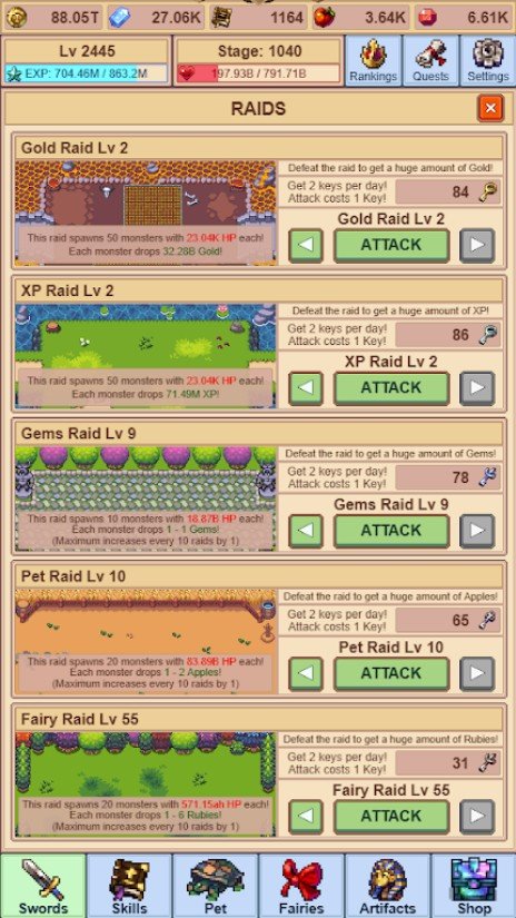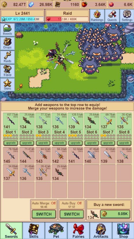Idle Sword Master - новая ролевая игра с олдскульной пиксельной графикой, видом сверху вниз и автоматическим прохождением без вашего участия. Сюжет игры проведет вас по запутанным подземным лабиринтам, в которых вас поджидают толпы голодных, злобных монстров. Сражаться вы с ними будете не только под землей, но и на поверхности. Но прежде, чем бросаться в бой, постарайтесь максимально повысить уровень своего аватара. Ведь именно от этого будет зависеть исход игры и ваше место в таблице многопользовательского рейтинга. А силы и возможности вашего подопечного, в свою очередь, зависят от мощи и силы меча, оказавшегося в его руках. Также сделать его эффективнее в боях можно с помощью редкого снаряжения, добытого в ожесточенных боях с врагами. Совершайте рейды по подземельях, собирайте редкие артефакты и снаряжение, объединяйте их между собой и разблокируйте особые навыки своего аватара. А накопленное в ваше отсутствие золото позволит увеличить ваши шансы на победу.