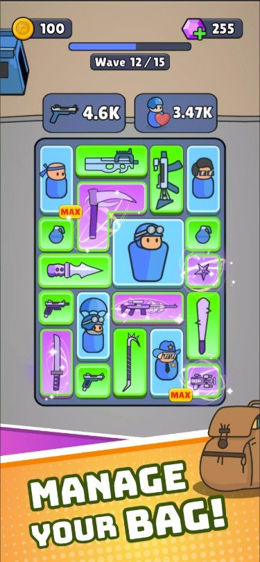 Battle Bag: War Zone - тактическая игра, смысл прохождения которой заключается в стратегическом размещении воинов на поле боя и управлении их снаряжением. Сами же сражения проходят в автоматическом режиме и, к слову, носят хаотический характер. Но успех на поле зависит еще и от численности армии. Откройте десятки солдат, которые за тем выйдут на поле боя. Также важно правильно подобрать оружие, а в арсенале его множество: винтовки, пулеметы, пистолеты и дробовики. Каждый из них - это определенное количество зарядов, скорострельность, сила удара и так далее. Все это придется учитывать перед очередным боем. Кроме того, очень важно правильно расположить оружие и подобрать оптимальную комбинацию. Экспериментируйте в разными составами своего отряда и оружием, и наслаждайтесь успехами на поле боя. Ключ к успеху - эффективная комбинация сил и средств. Остается просто наблюдать за тем, как ваша отлично подготовленная и вооруженная армия побеждает врага.